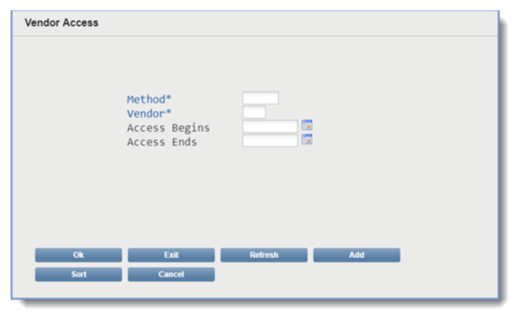 When the Vendor Access definition screen displays, define the Vendor specifications