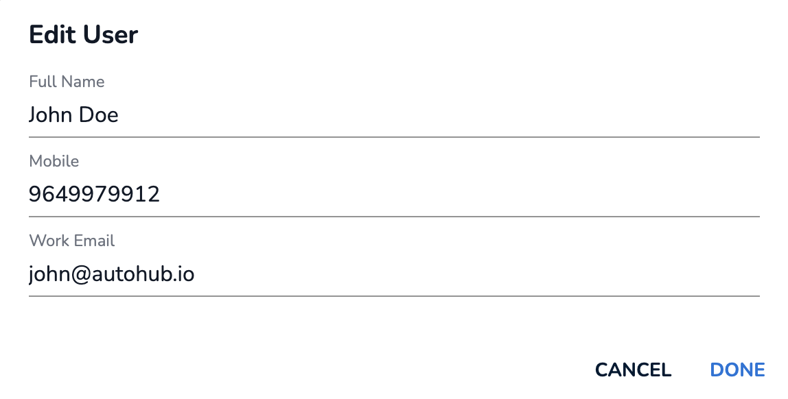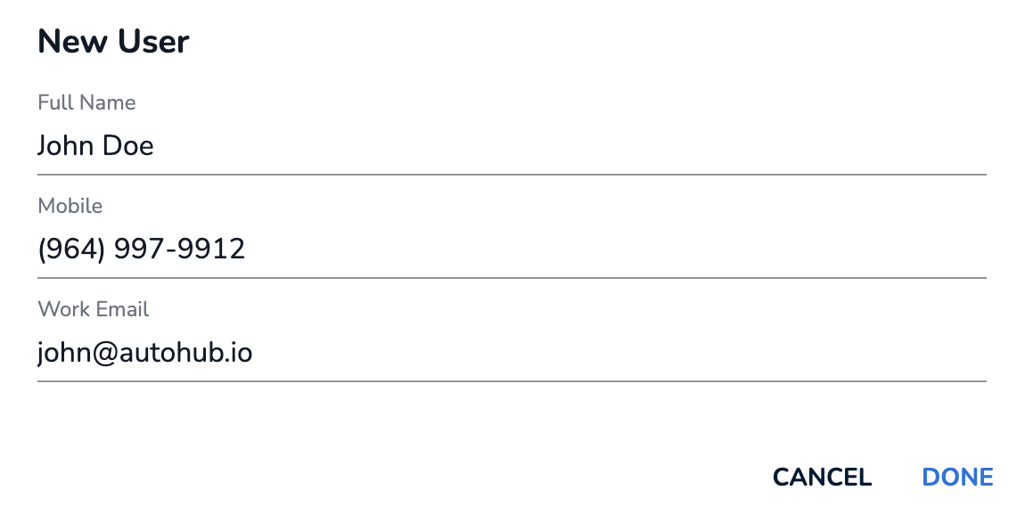 Enter the user's full name, mobile phone number, and work email. Then click done.