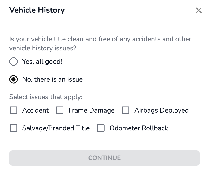 Declare the history of the vehicle. You are confirming the title is clean and free of any accidents and history issues. If there is an issue you will select the issue(s) that apply. Examples of issues are accidents, frame damage, deployed airbags, title issues, and odometer rollback.