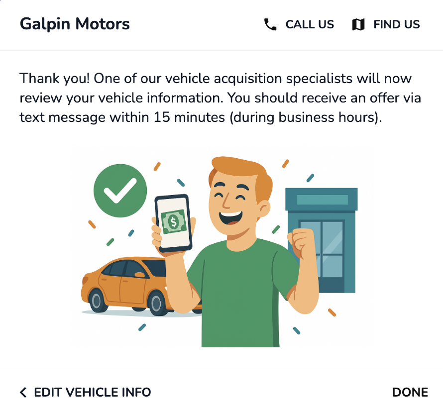 Submit the vehicle information. The dealership will now be sent a lead via the AutoHub Portal and the CRM to review the vehicle information and extend an official offer to the recipient, AutoHub does not send out automated offers to customers from Online Offer + Leads.